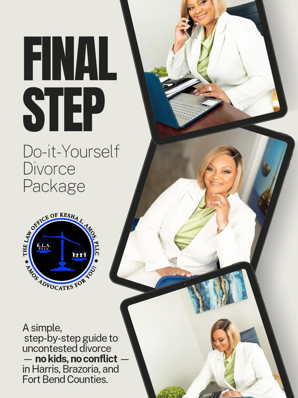 The Final Step Divorce Package is a simple, step-by-step guide for uncontested divorces with no kids in Harris, Brazoria, and Fort Bend Counties. For $699, you’ll get clear instructions plus an attorney review of your Final Decree before filing — so you can move forward with confidence.